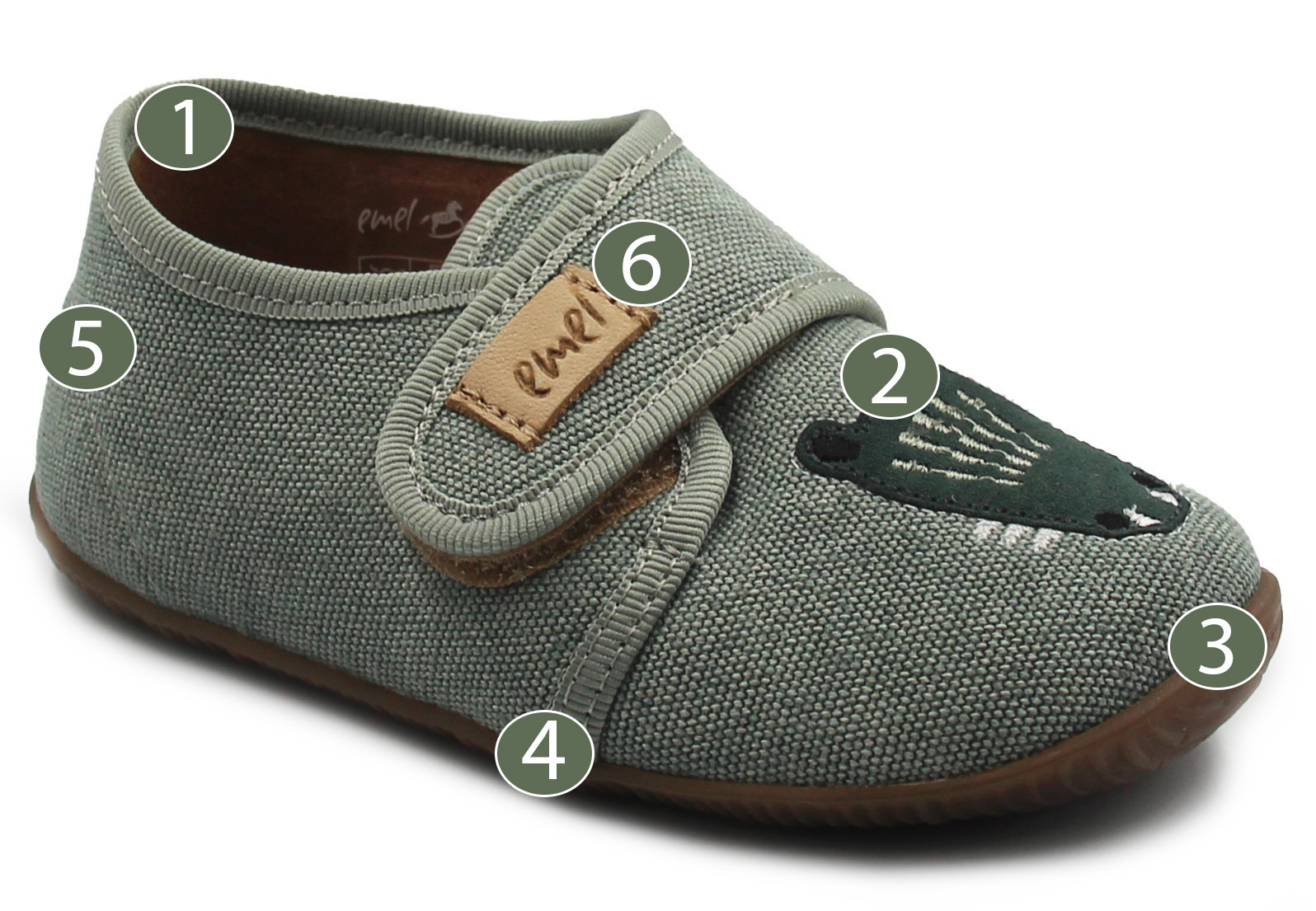 6. Zapięcie na rzep, umożliwia dopasowanie kapci do stopy dziecka.