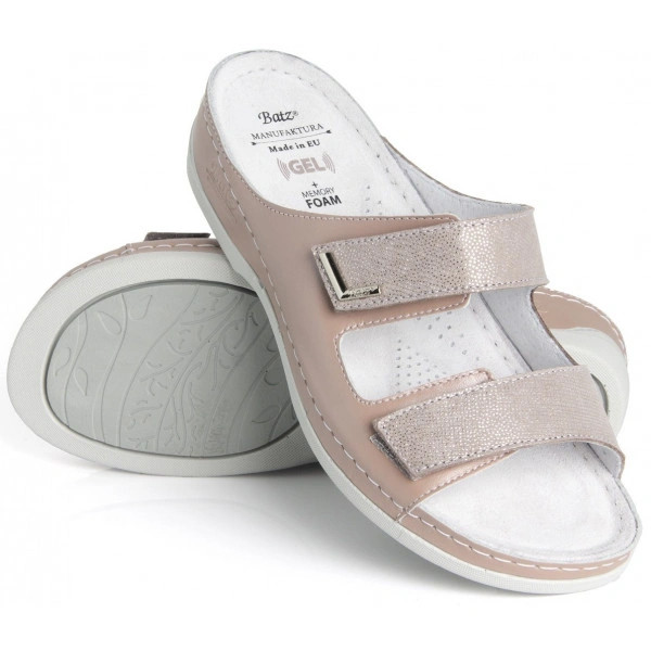 Klapki damskie Batz Lia to model wykonany z 100% prawdziwej skóry naturalnej. Cholewka jest szyta ręcznie, a wkładka wykonana jest z pianki Memory Foam z dodatkową miękką żelową wkładką pod piętą. Dzięki dwóm regulowanym rzepom klapki można idealnie dopasować do tęgości stóp.