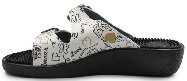 Klapki wyposażone są w kolce, które stymulują punkty akupresury w stopach.
