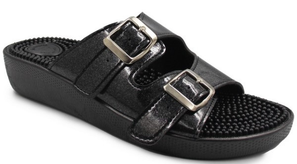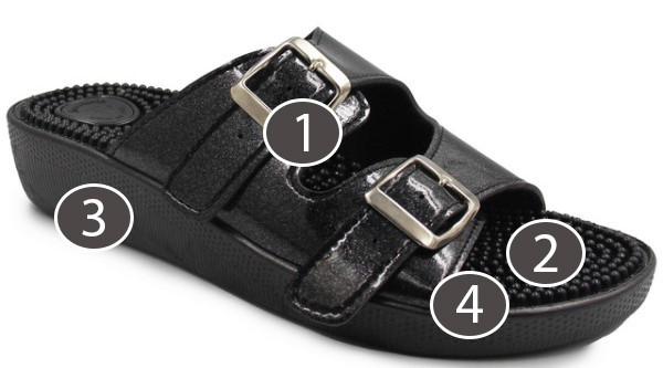 Klapki wyposażone są w kolce, które stymulują punkty akupresury w stopach.