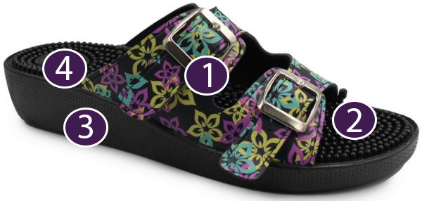 Klapki wyposażone są w kolce, które stymulują punkty akupresury w stopach.
