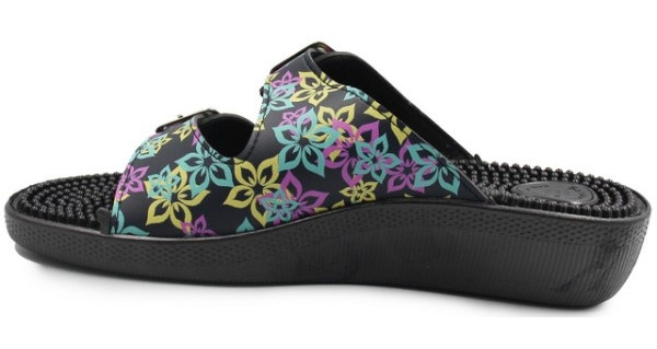 Klapki wyposażone są w kolce, które stymulują punkty akupresury w stopach.