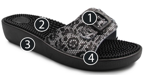Klapki wyposażone są w kolce, które stymulują punkty akupresury w stopach.