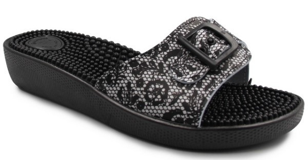 Klapki wyposażone są w kolce, które stymulują punkty akupresury w stopach.