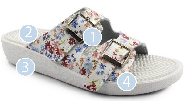 Klapki wyposażone są w kolce, które stymulują punkty akupresury w stopach.