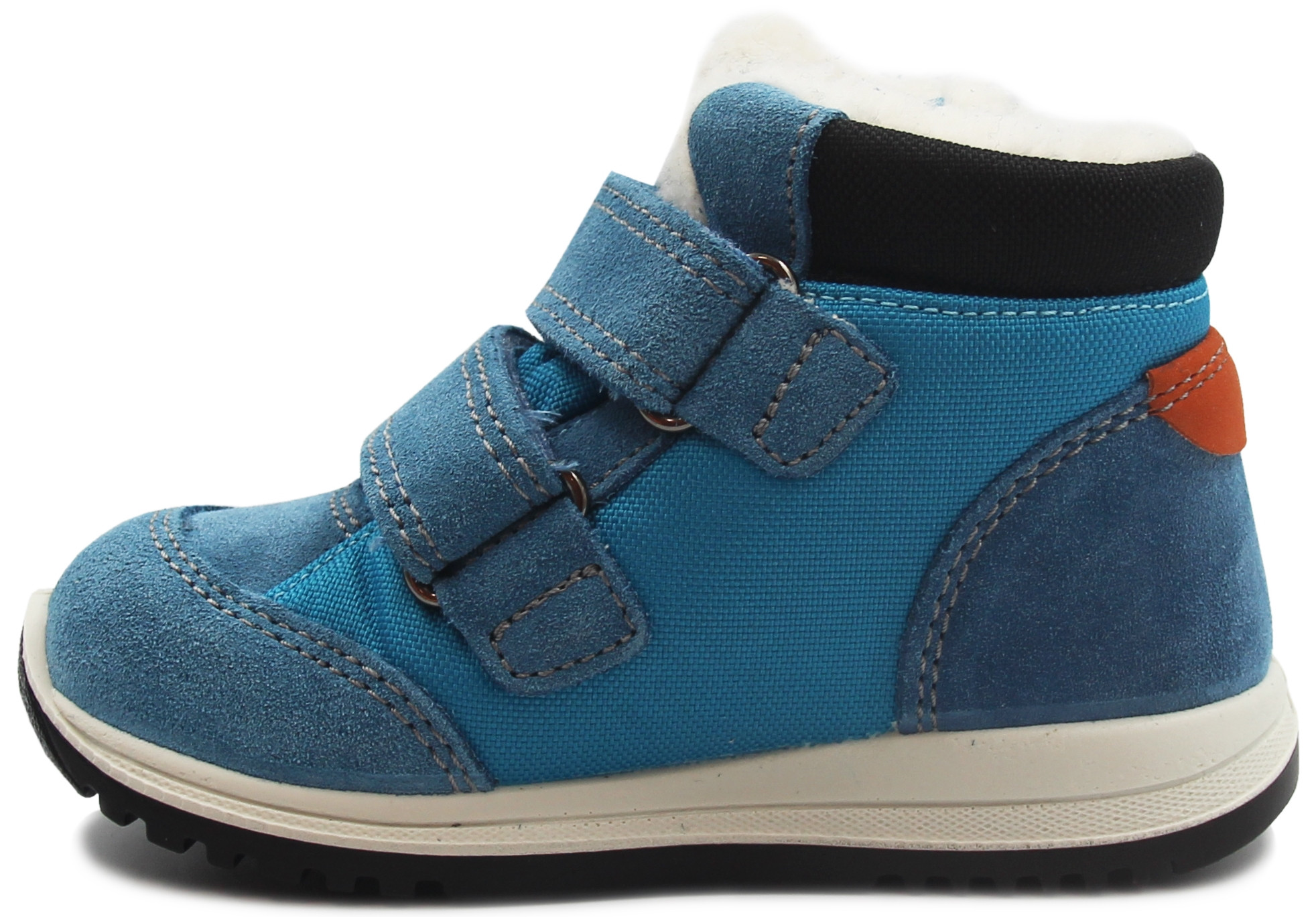 ❄️ Cholewka wykonana jest z wysokiej jakości skóry naturalnej nubukowej oraz materiału tekstylnego, w kolorze niebieskim, co gwarantuje elastyczność, przewiewność i dopasowuje się do kształtu stopy dziecka