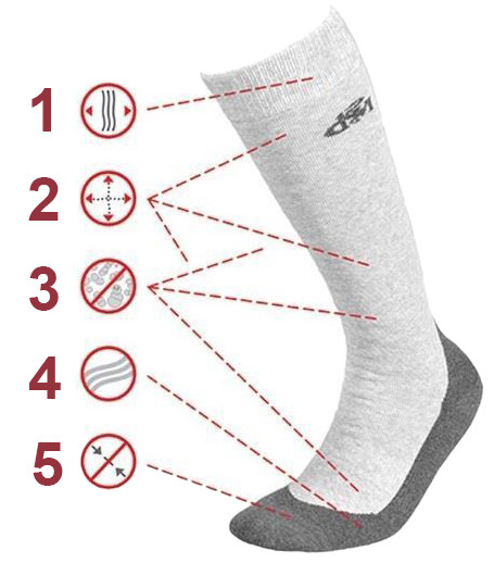 - Specjalna konstrukcja cholewki i niewielka domieszka lycry w całej skarpetce powodują idealne, bezuciskowe przyleganie do nóg i maksymalną elastyczność