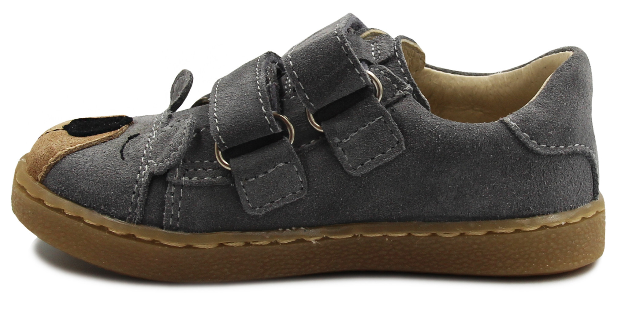 Półbuty w kolorze szarym z motywem misia, wyprodukowane w całości ze skóry naturalnej welurowej. Wnętrze wyścielone skórą, usztywniona piętka, odpowiednia wysokość cholewki, wkładka skórzana profilowana - odpowiednio kształtuje prawidłowy rozwój stopy. Zapięcie regulowane dwoma rzepami. Podeszwa z termokauczuku elastyczna, antypoślizgowa oraz przyszyta do cholewki.