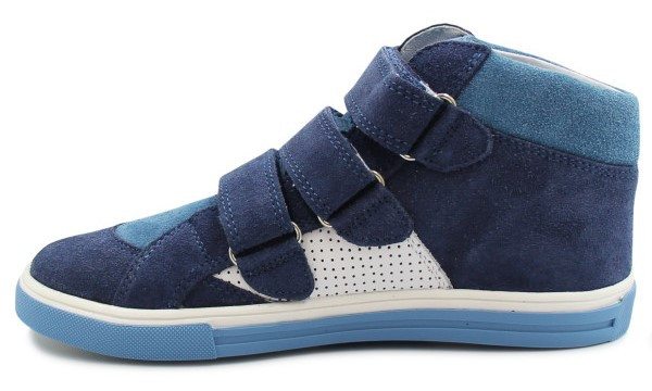 Modny sportowy styl trzewików zadowoli każdego chłopca. Wysoka cholewka wykonana z naturalnego miękkiego weluru połączonego z naturalną gładką skórą licową, posiada specjalne zakładki zabezpieczające pięty chroniąc stopy młodego użytkownika przed skręceniem a wykończenie miękkim piankowym kołnierzem chroni kostki przed obtarciami.