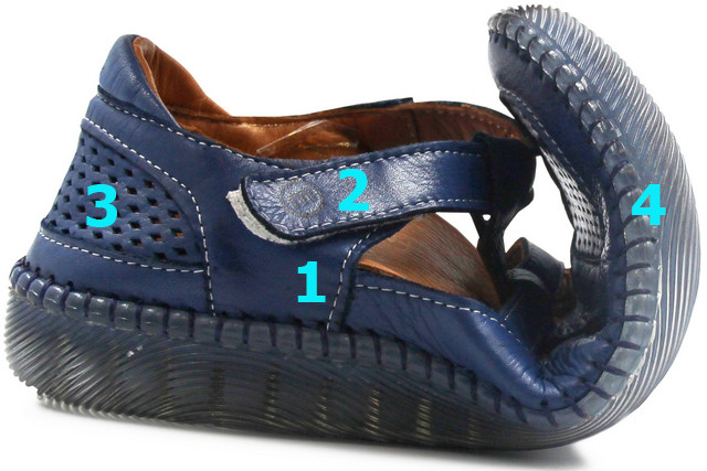 1. Skórzana cholewka, wyściółka oraz wkładka, zapewniając komfort noszenia przez cały dzień.