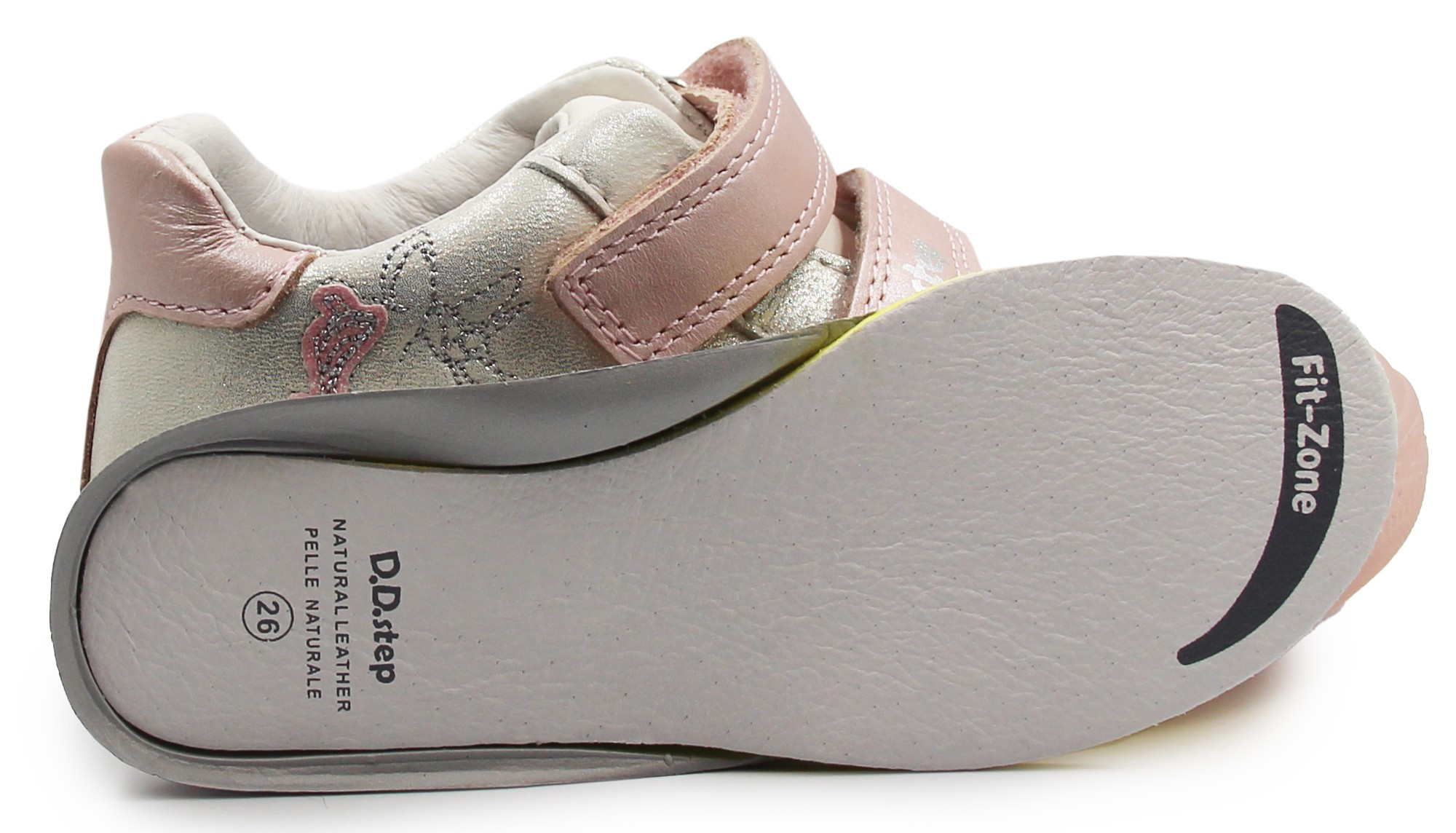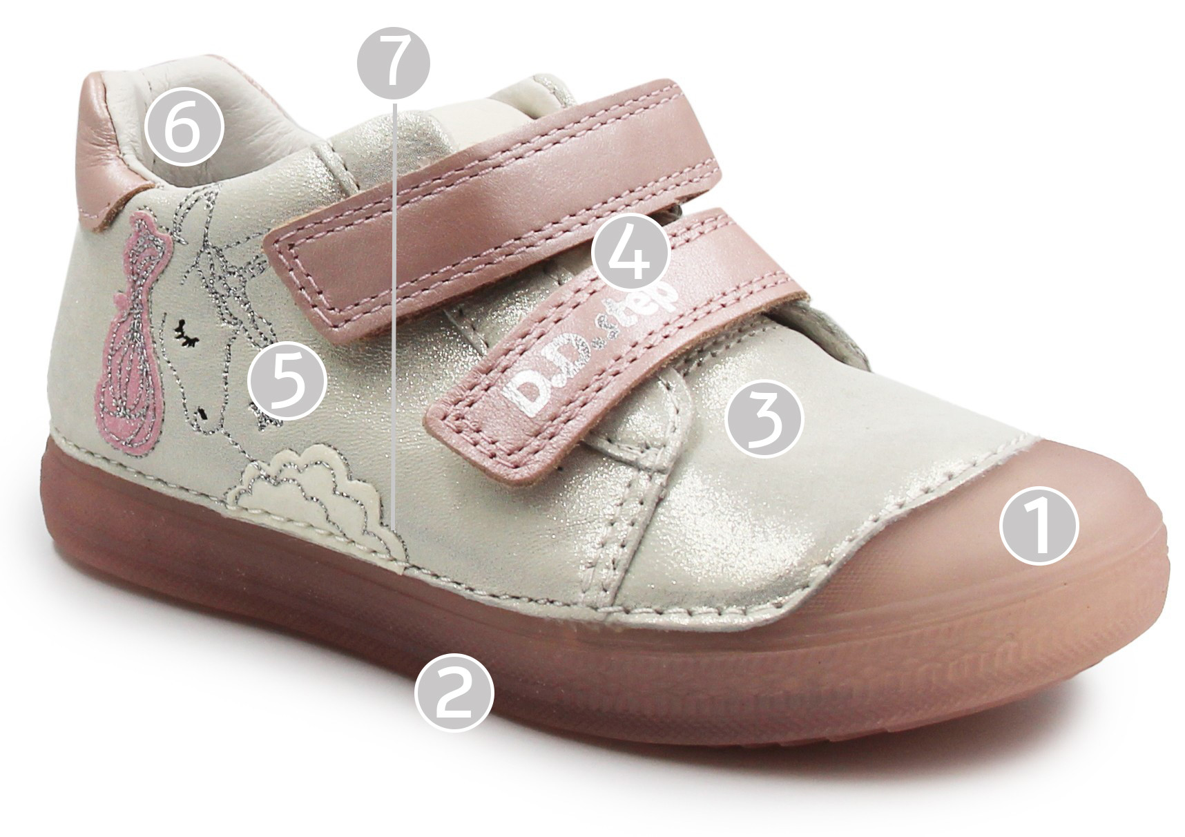 Buty dla dziewczynki w uroczej kolorystyce z motywem jednorożca. Zapinane za pomocą dwóch praktycznych rzepów, które umożliwiają dziecku samodzielne założenie oraz zdjęcie obuwia. Podeszwa tworzy u spodu jednorożca. Wnętrze wykonane jest z miękkiej skóry.