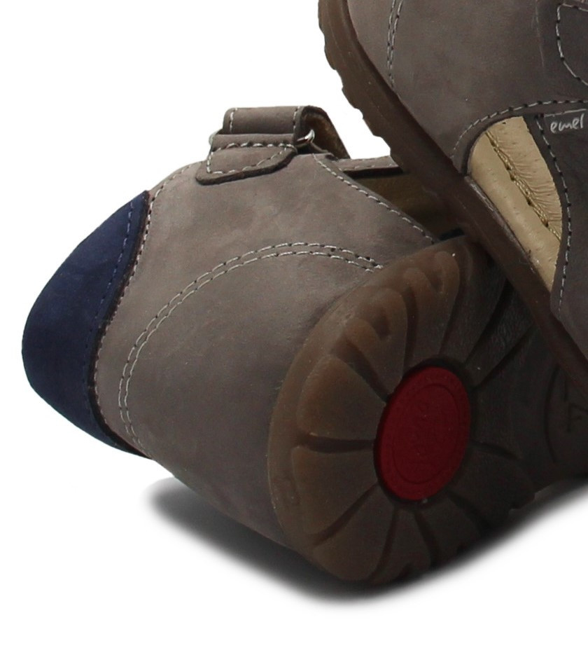 Czerwony punkt na podeszwie sandałów Emel ES 2437-31 to oznaczenie punktu środka ciężkości stopy. Znajduje się on na podeszwie pod piętą dziecka i ma za zadanie ułatwić prawidłowe ułożenie stopy podczas chodzenia.