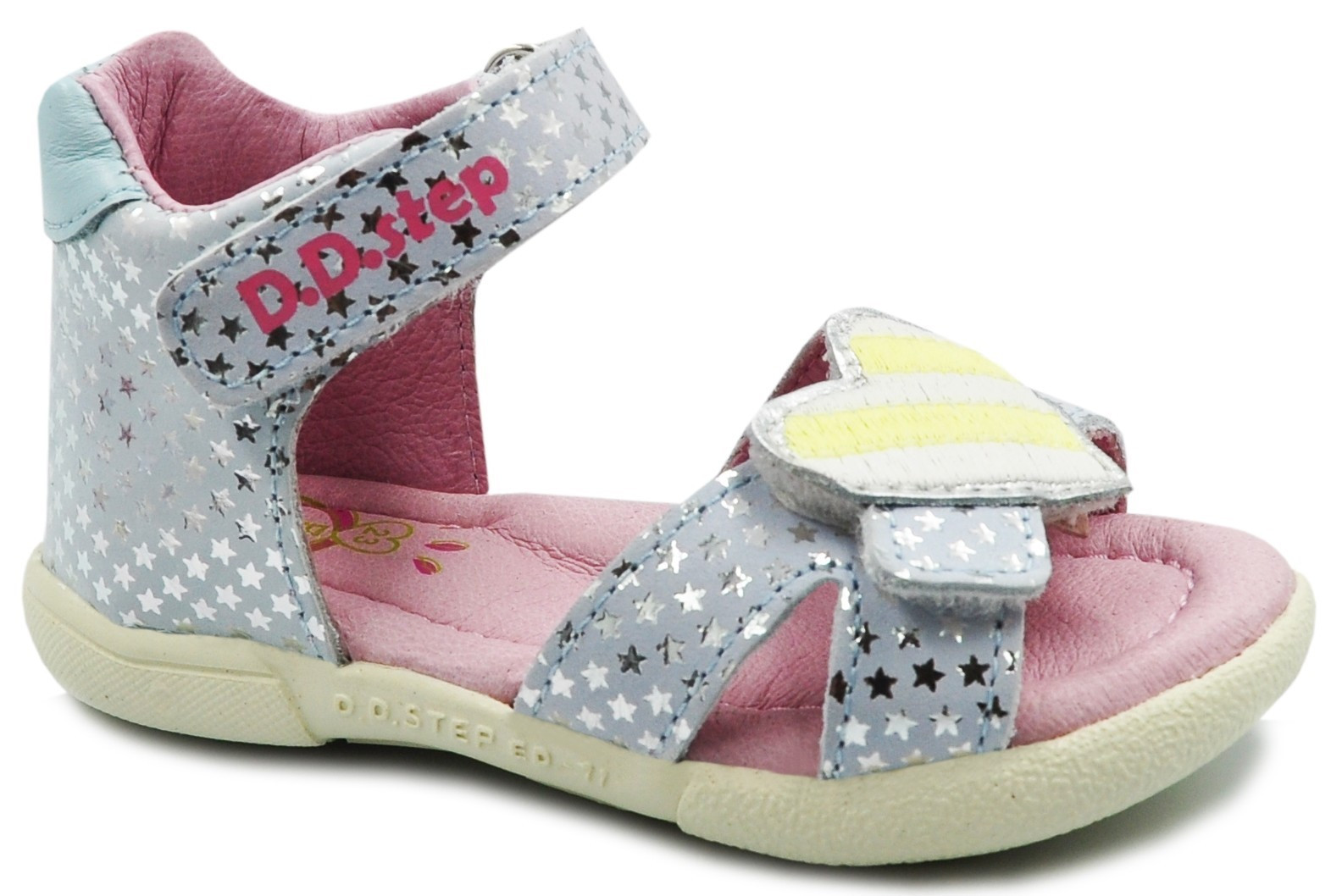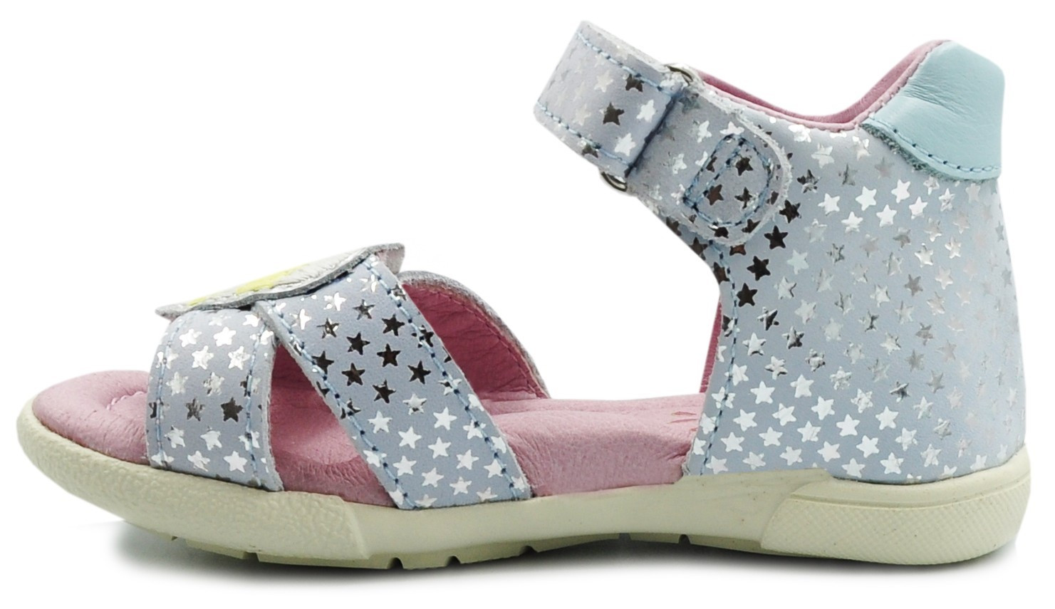 Sandałki dla dziewczynki w gwiazdki z dodatkowym elementem serduszka. Posiadają dwa zapięcia na rzep, które umożliwiają dopasowanie obuwia do szerokości stopy dziecka. Wnętrze skórzane wypełnione jest miękka pianką, by zapewnić komfort podczas noszenia.