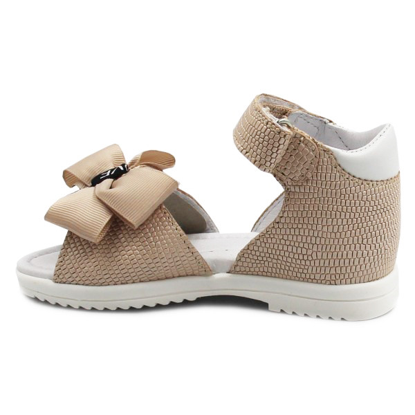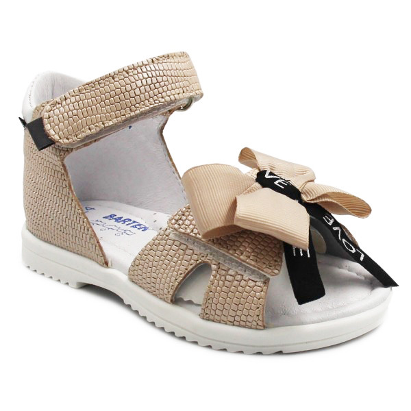 Sandałki dla dziewczynki z zabudowaną piętą. Wypełnione miękką pianką, by zapewnić dziecku komfort podczas noszenia. Kokardka umieszczona na przodzie sandałków dodaje im elegancji oraz uroku. Wnętrze sandałów wykonane jest ze skóry, która pokryta jest miękką pianką.