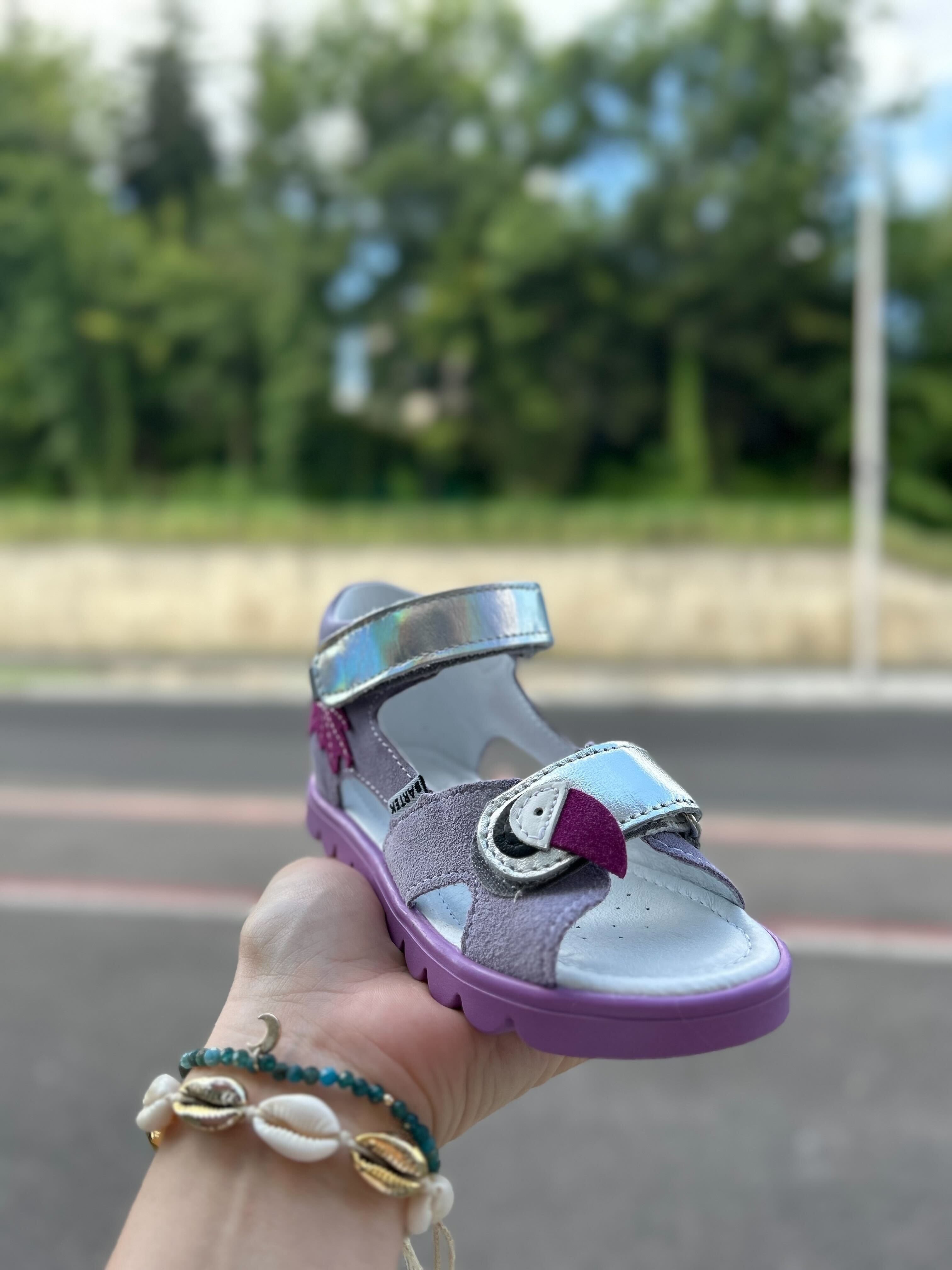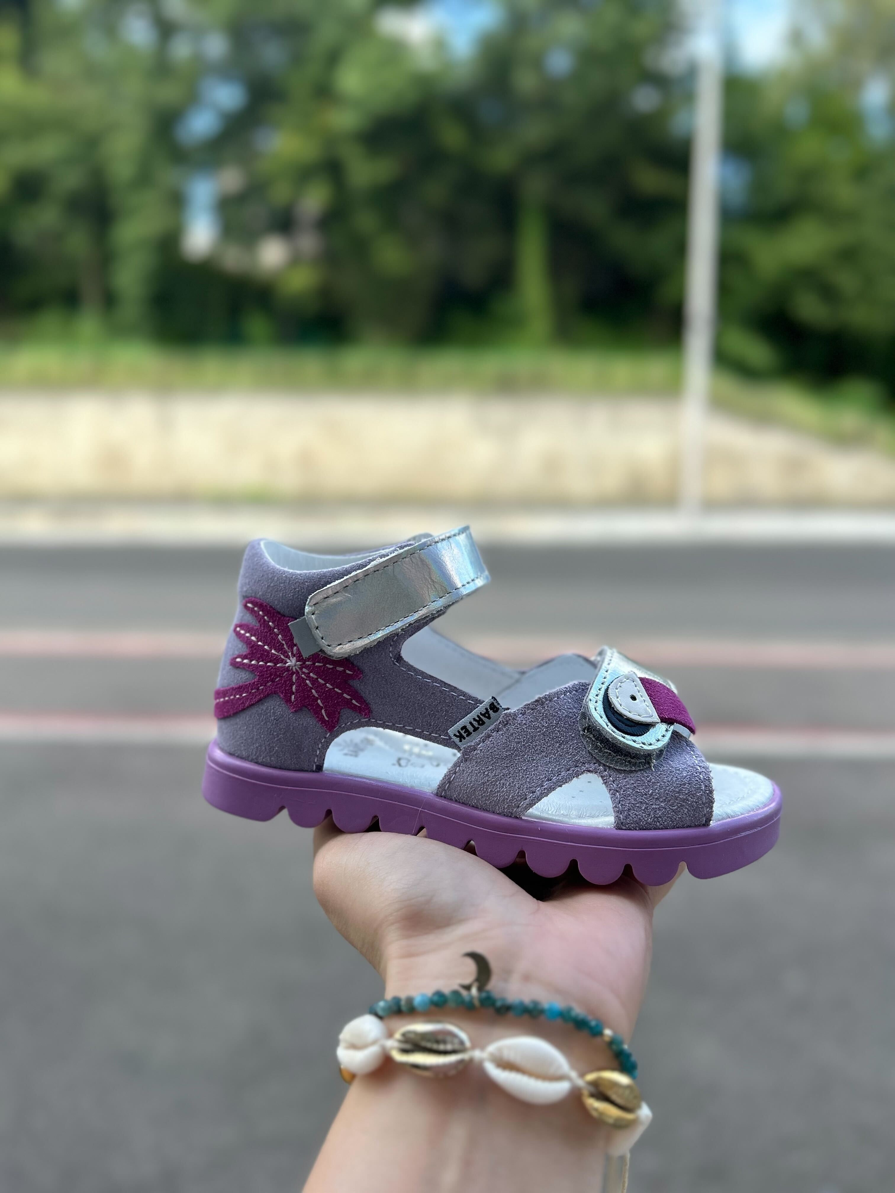 Sandały dziewczęce z zabudowana piętą, w uroczym kolorze oraz wakacyjnym wzorem. Cholewka została wykonana ze skóry naturalnej licowej oraz weluru. W okolicach pięty zastosowano miękką pianką, która ma na celu zapobieganie powstawaniu odcisków. Wkładka posiada właściwości oddychające, by stopa mogła swobodnie oddychać. Zapięcie za pomocą dwóch rzepów umożliwia dziecku samodzielne zakładanie i zdejmowanie butów oraz dopasowanie do stopy.