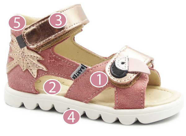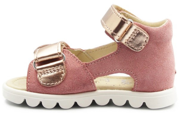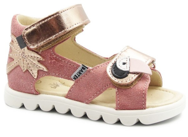 Sandały dziewczęce z zabudowana piętą, w uroczym kolorze oraz wakacyjnym wzorem. Cholewka została wykonana ze skóry naturalnej licowej oraz weluru. W okolicach pięty zastosowano miękką pianką, która ma na celu zapobieganie powstawaniu odcisków. Wkładka posiada właściwości oddychające, by stopa mogła swobodnie oddychać. Zapięcie za pomocą dwóch rzepów umożliwia dziecku samodzielne zakładanie i zdejmowanie butów oraz dopasowanie do stopy.