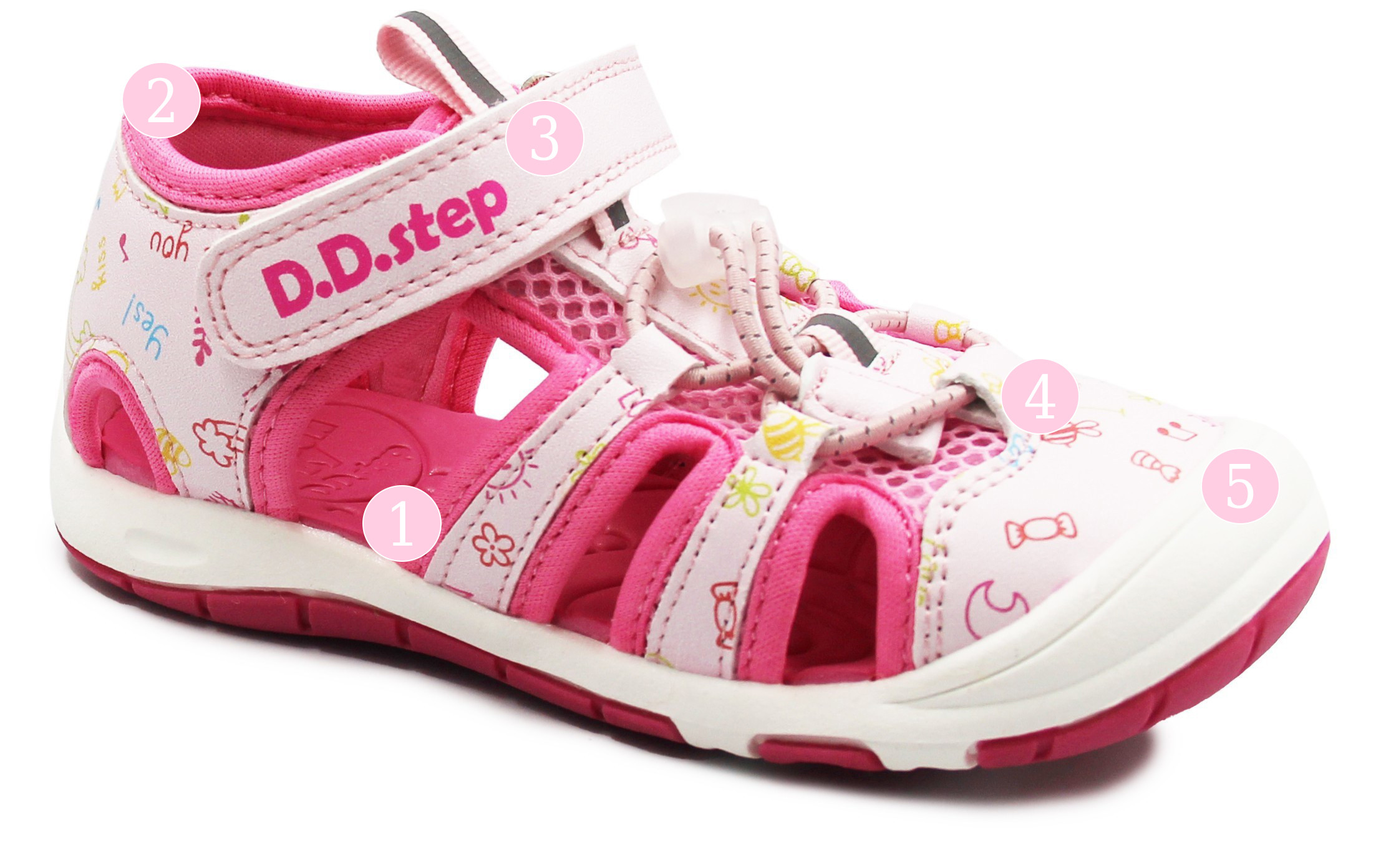 2️⃣ Podwyższony zapiętek chroni stopę dziecka przed urazami i obtarciami.
