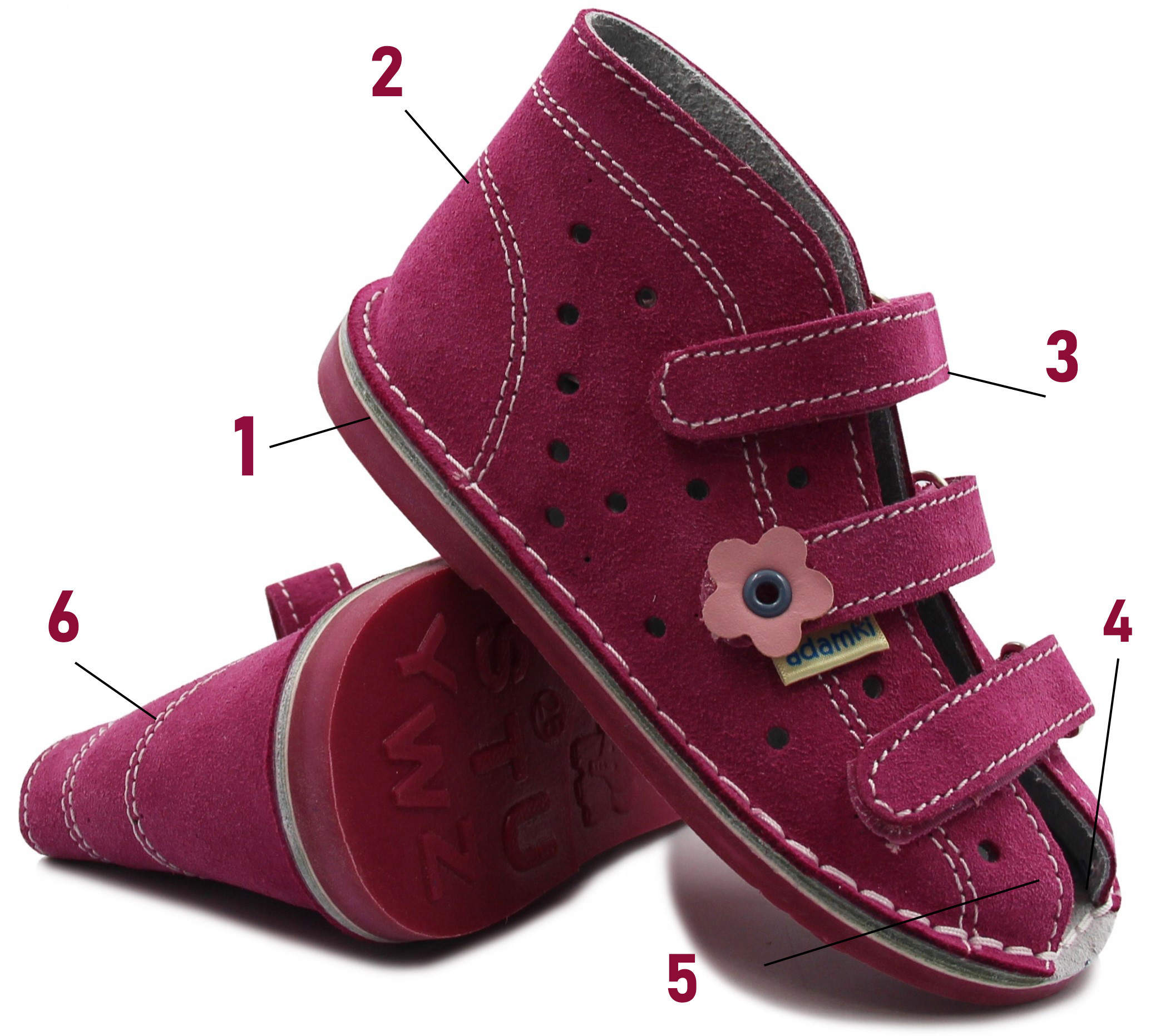 2 - Usztywniony zapiętek - wysoka, usztywniona cholewka ze skóry naturalnej utrzymuje stopy we właściwym położeniu i zapobiega deformacjom obuwia w okolicy pięty