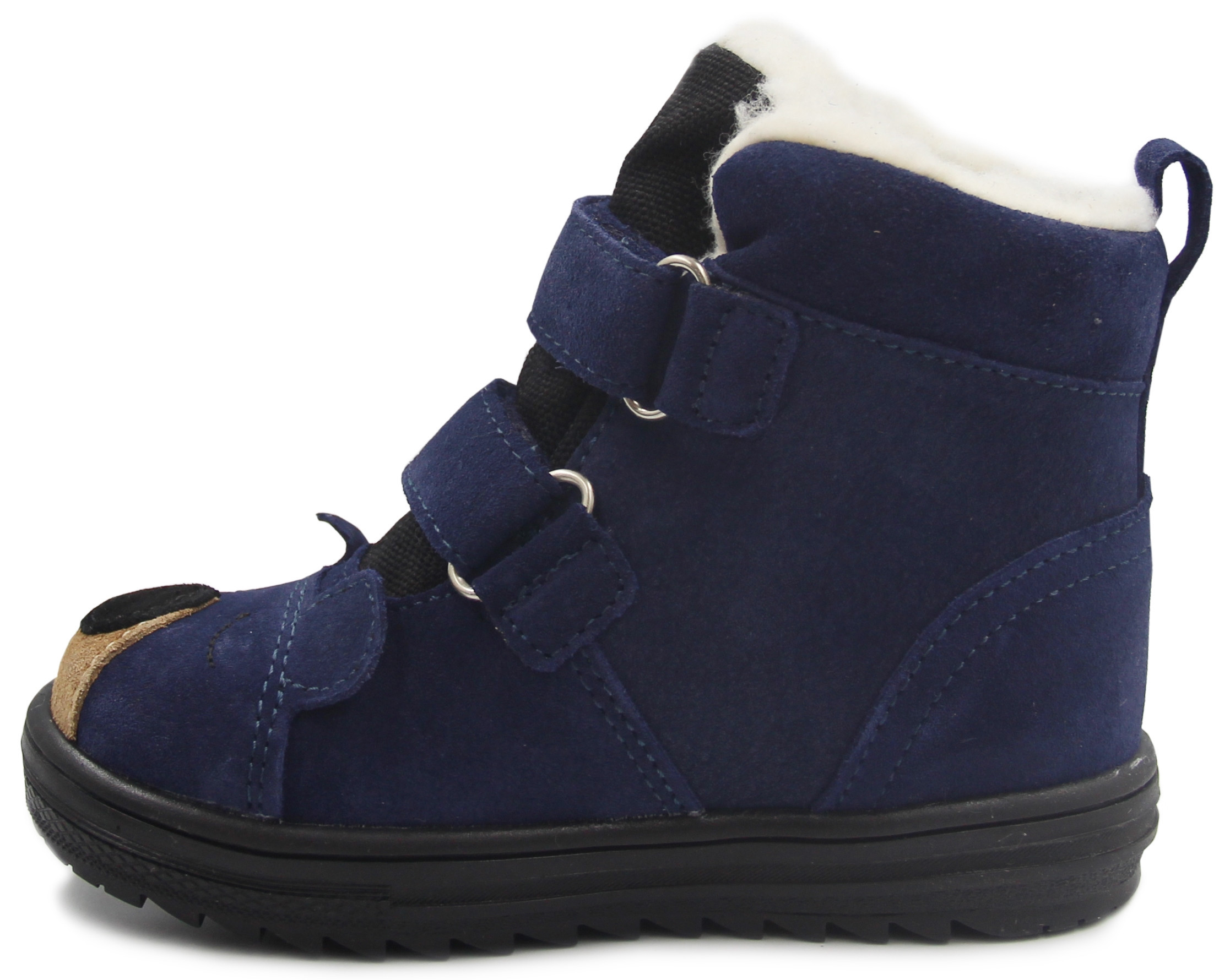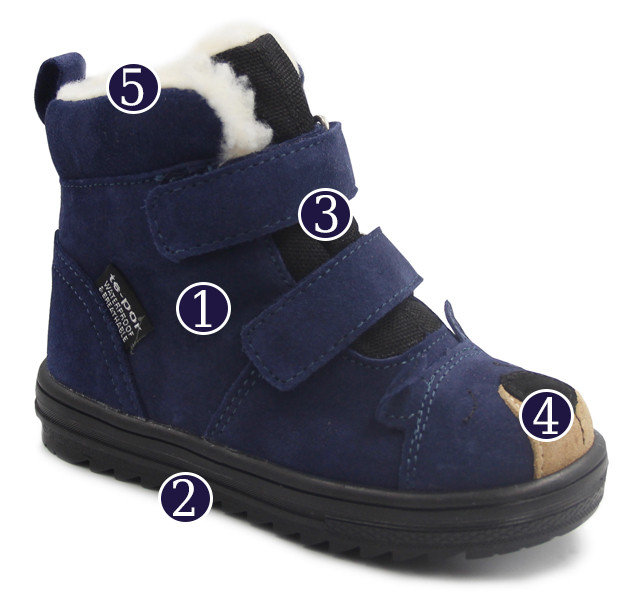 Buty wykonane z wysokiej jakości naturalnej skóry welurowej. Na czubkach posiadają dodatkowy element ozdobny, który urozmaica ich wygląd. Wewnątrz są wyposażone w membranę, która posiada właściwości sprzyjające podczas zimowych dni. Wkładka butów posiada warstwę termoizolacyjną, która ma za zadanie ogrzewać stopy dziecka.