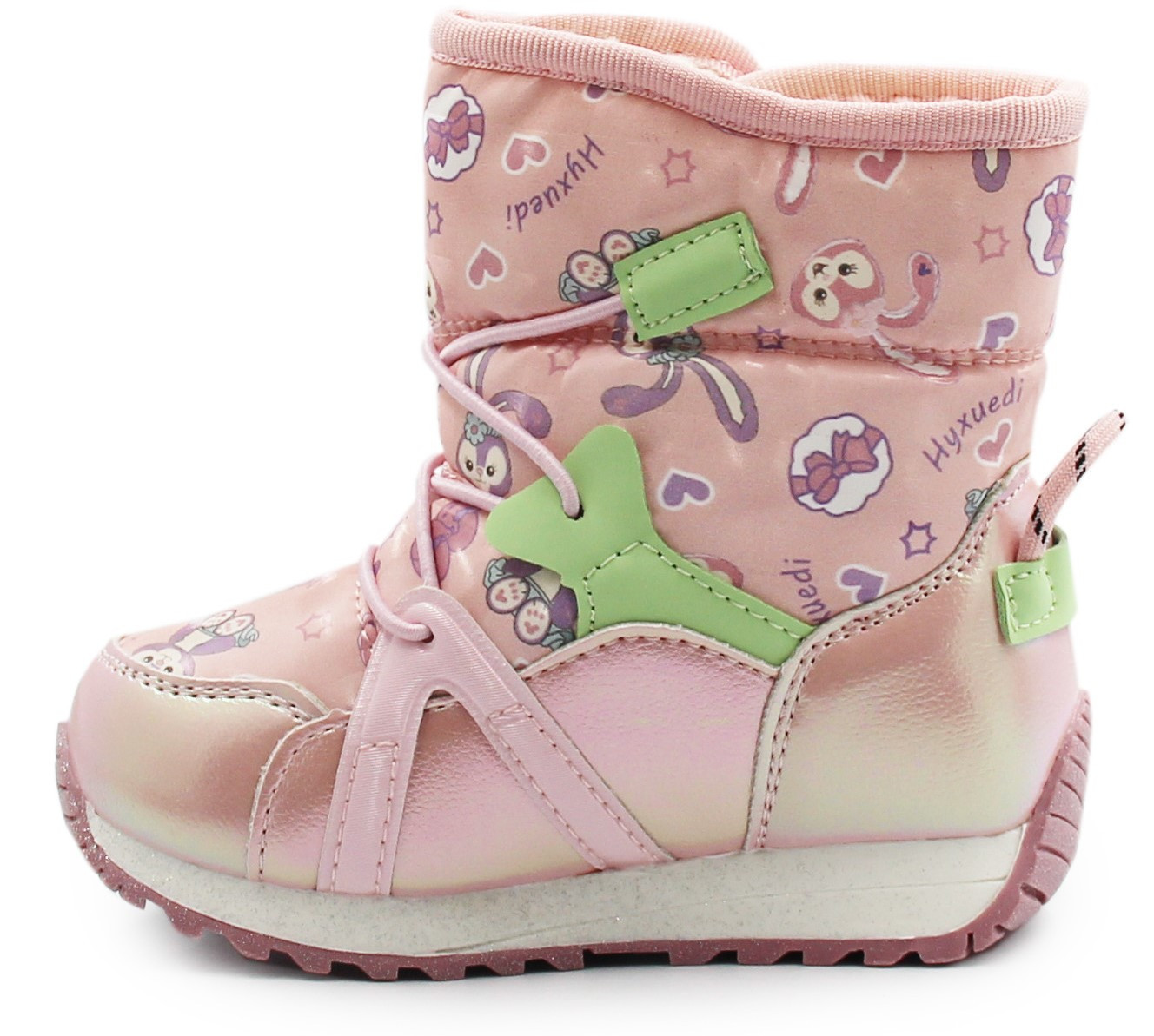 Ocieplane śniegowce dla dziewczynki, wnętrze wypełnione miękkim i ocieplanym materiałem. Wykonane w różowej dziewczęcej kolorystyce z dodatkowymi elementami. Zadaniem kożuszka jest zapewnienie ocieplenia stopie podczas chłodniejszych temperatur. Wyposażone w właściwości wodoodporne. Płaska, grubsza podeszwa z bieżnikiem, wykonana z wysokogatunkowego tworzywa. Dolna część cholewki stanowi całość z podeszwą, do wysokości szwu jest nieprzemakalna.