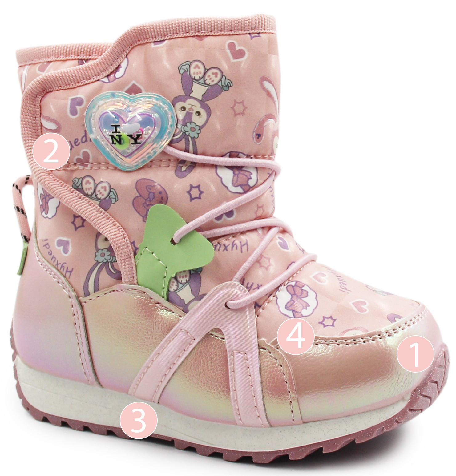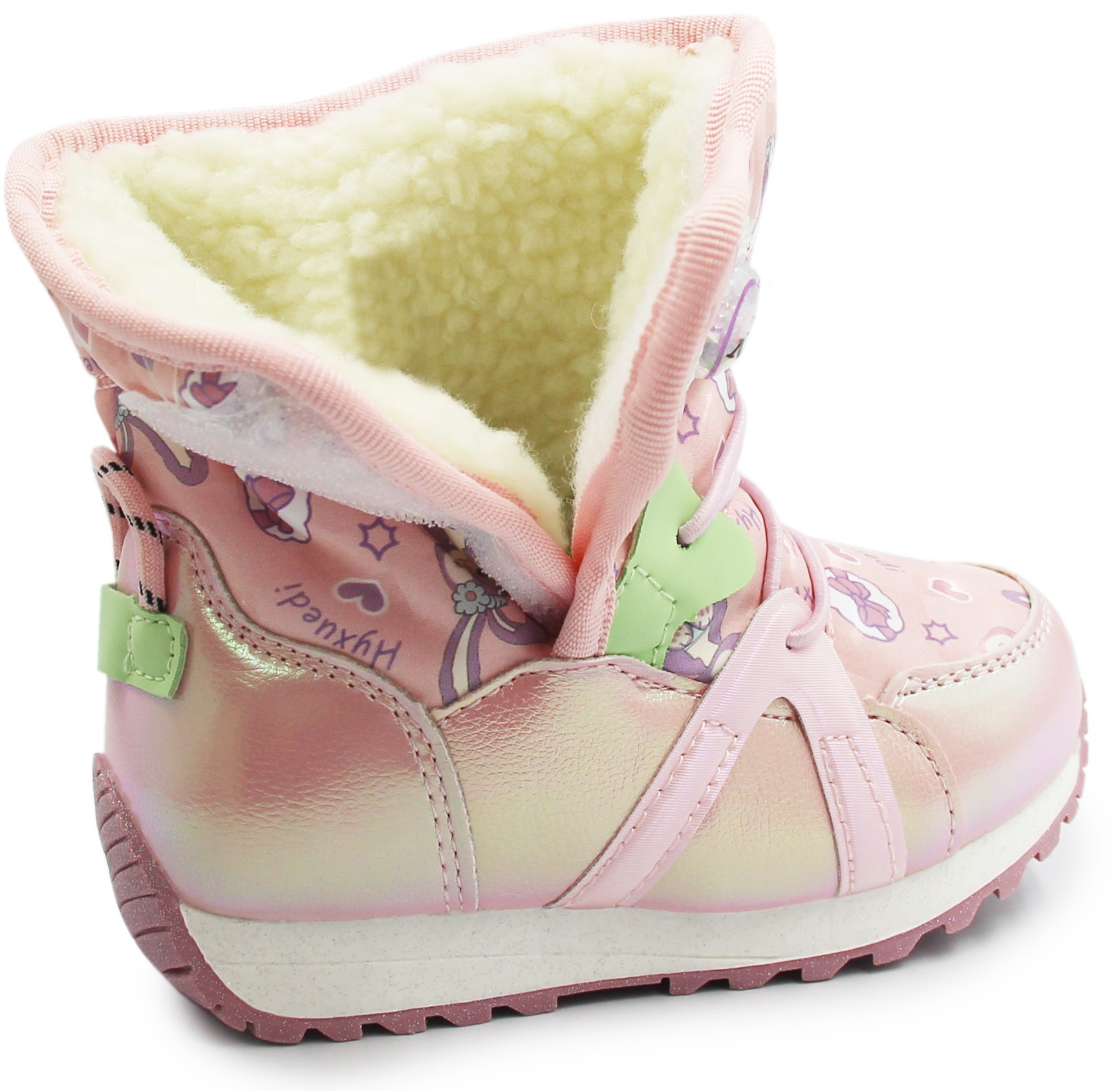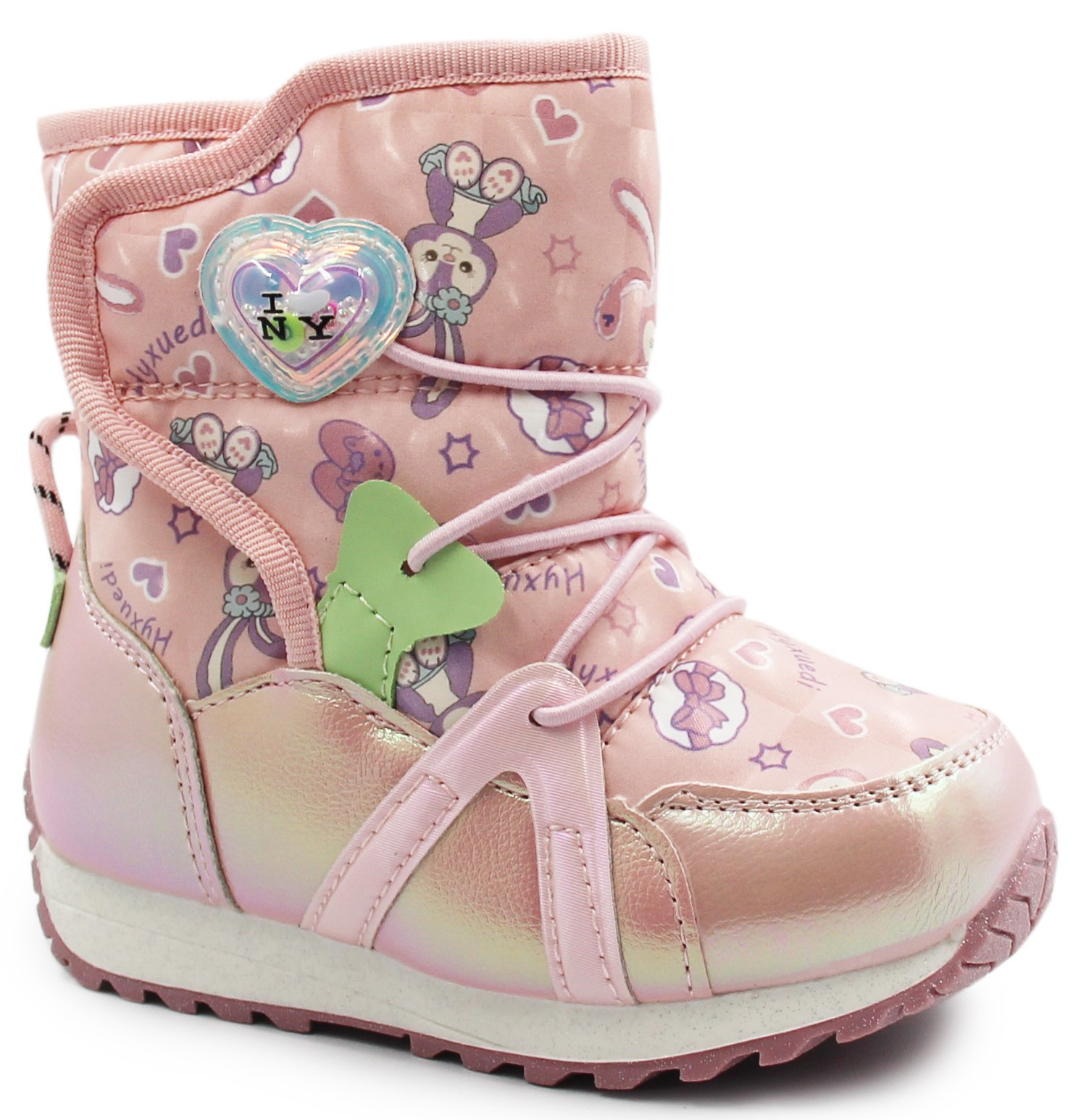 Ocieplane śniegowce dla dziewczynki, wnętrze wypełnione miękkim i ocieplanym materiałem. Wykonane w różowej dziewczęcej kolorystyce z dodatkowymi elementami. Zadaniem kożuszka jest zapewnienie ocieplenia stopie podczas chłodniejszych temperatur. Wyposażone w właściwości wodoodporne. Płaska, grubsza podeszwa z bieżnikiem, wykonana z wysokogatunkowego tworzywa. Dolna część cholewki stanowi całość z podeszwą, do wysokości szwu jest nieprzemakalna.