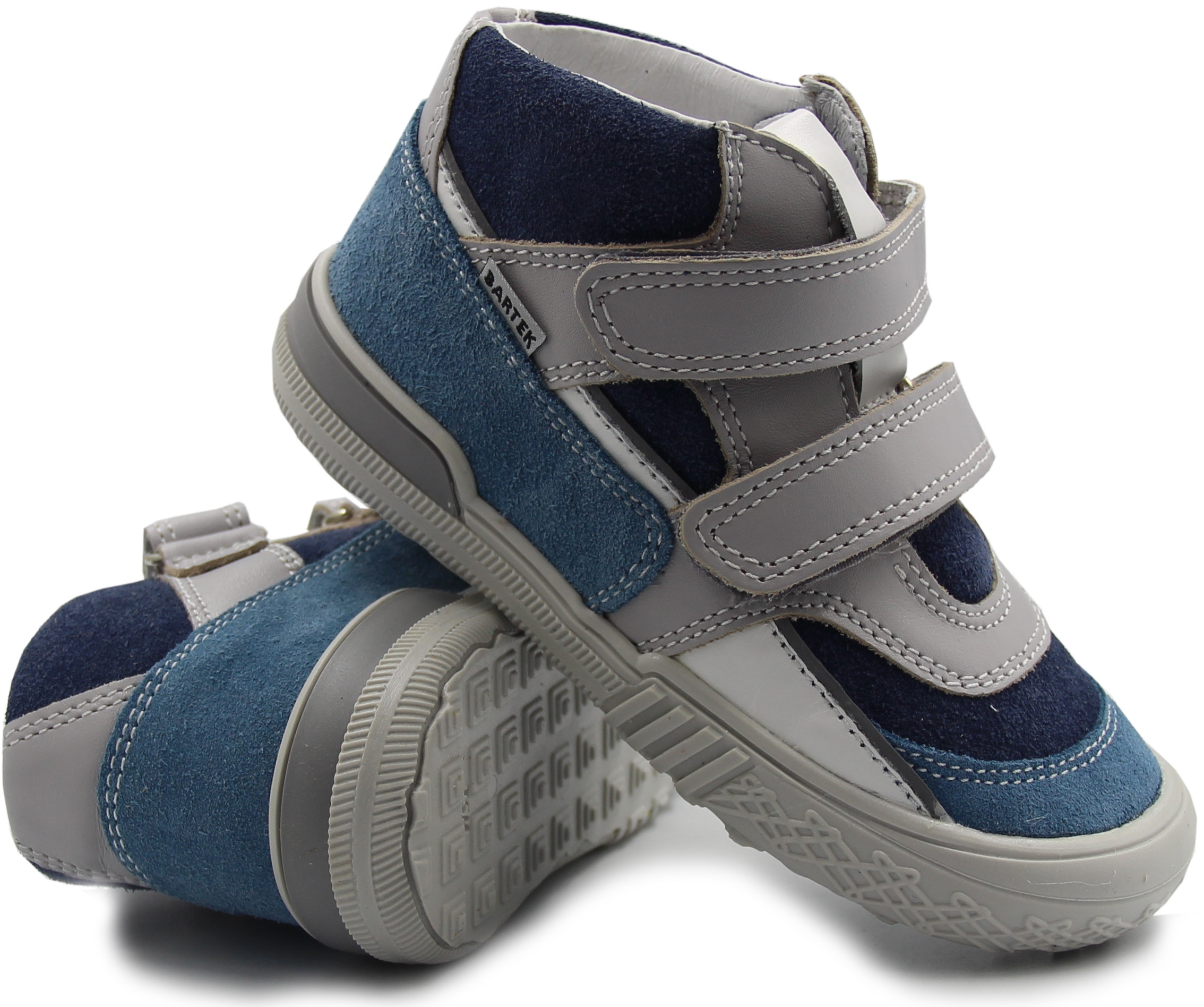 Chłopięce sportowe trzewiki firmy Bartek w kolorze szaro-niebieskim.
