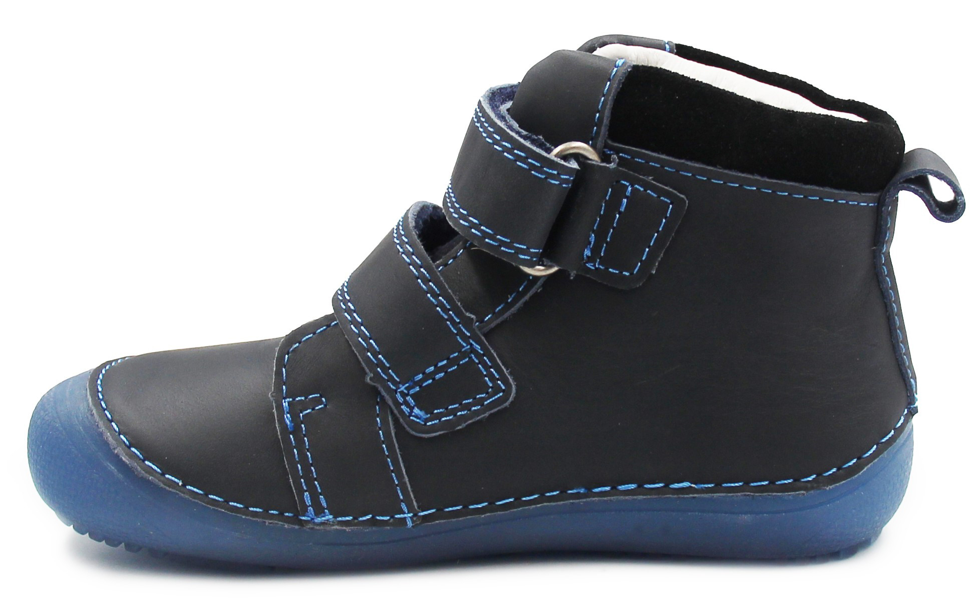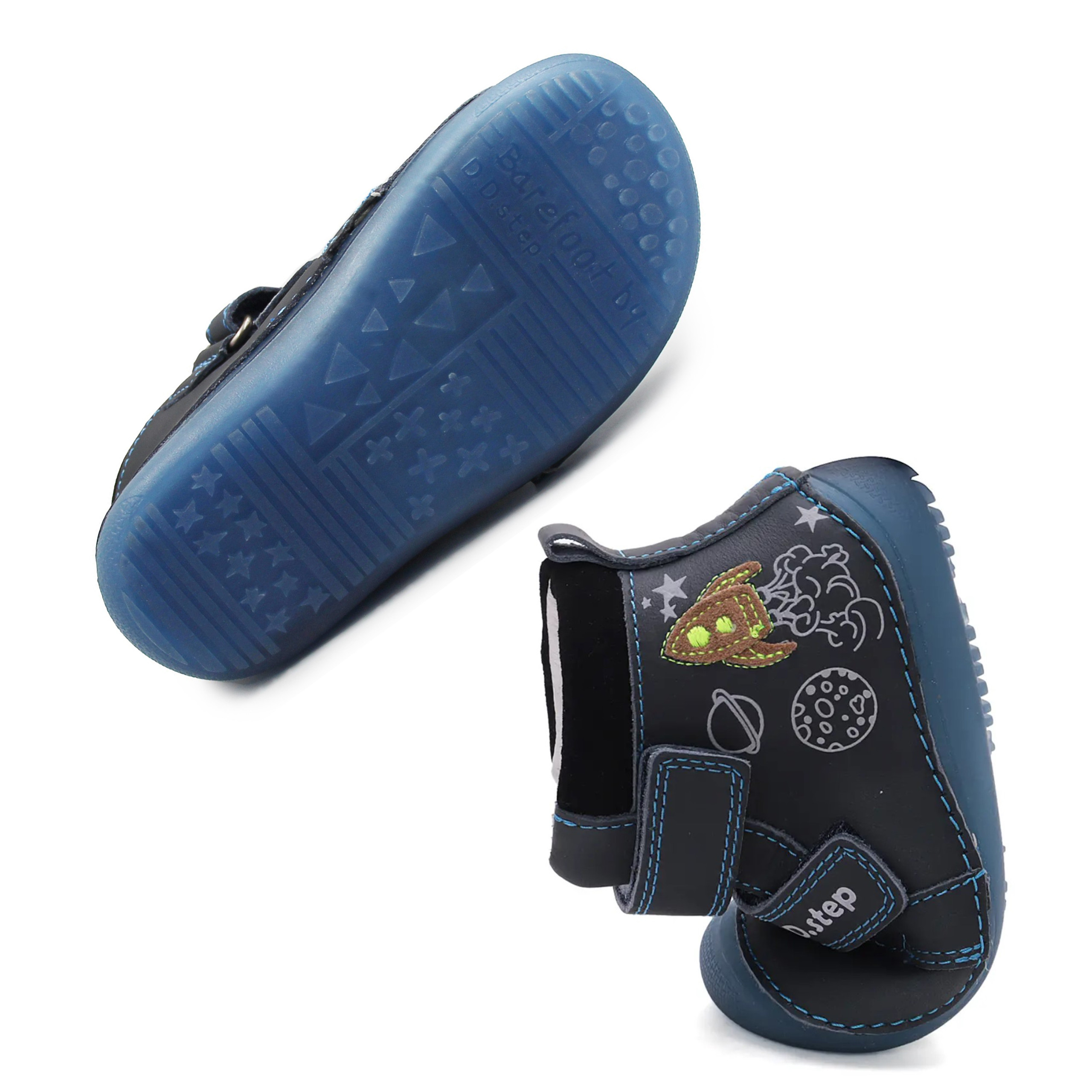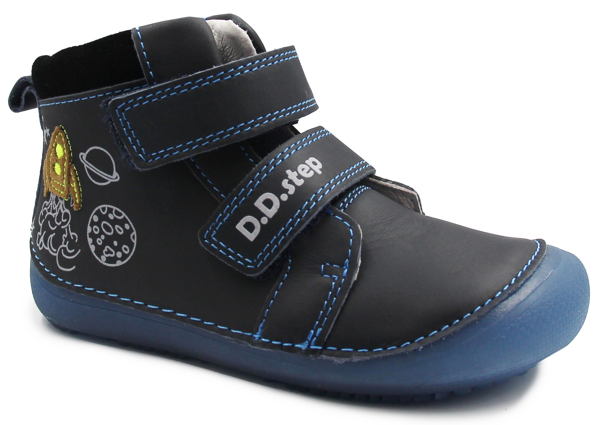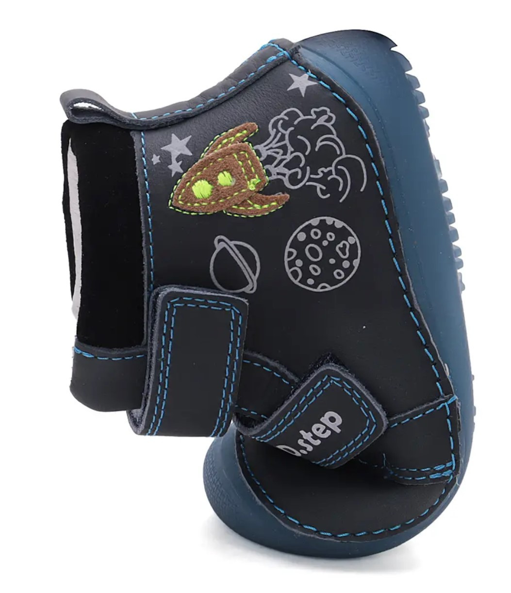 Chłopięce buty wykonane ze skóry naturalnej (licowanej). Wyposażone w dwa wygodne oraz praktyczne rzepy. Podeszwa jest bardzo elastyczna i pozwala stopie na naturalny oraz swobodny ruch. Wkładka jest wyjmowana, posiada zerowy spadek. Obuwie posiada miękki zapiętek. Z boku buty posiadają ozdobne elementy, które spodobają się małym astronautom.