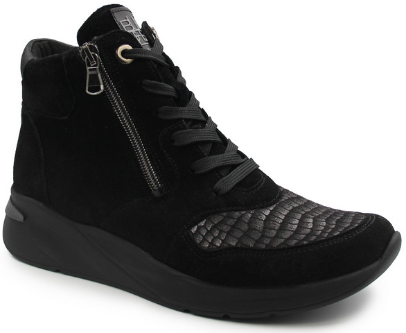 Damskie botki z ociepleniem o poszerzonej tęgości, zapinane za pomocą sznurowadeł oraz zamka błyskawicznego z ozdobnym nadrukiem imitacji wężowej. Wyposażone w wyjmowaną wkładkę. Wykonane z wysokiej jakości materiałów skóry nubukowej, syntetycznej, zamszowej oraz skór naturalnych, które dopasowują się do stopy nie powodując ucisków.