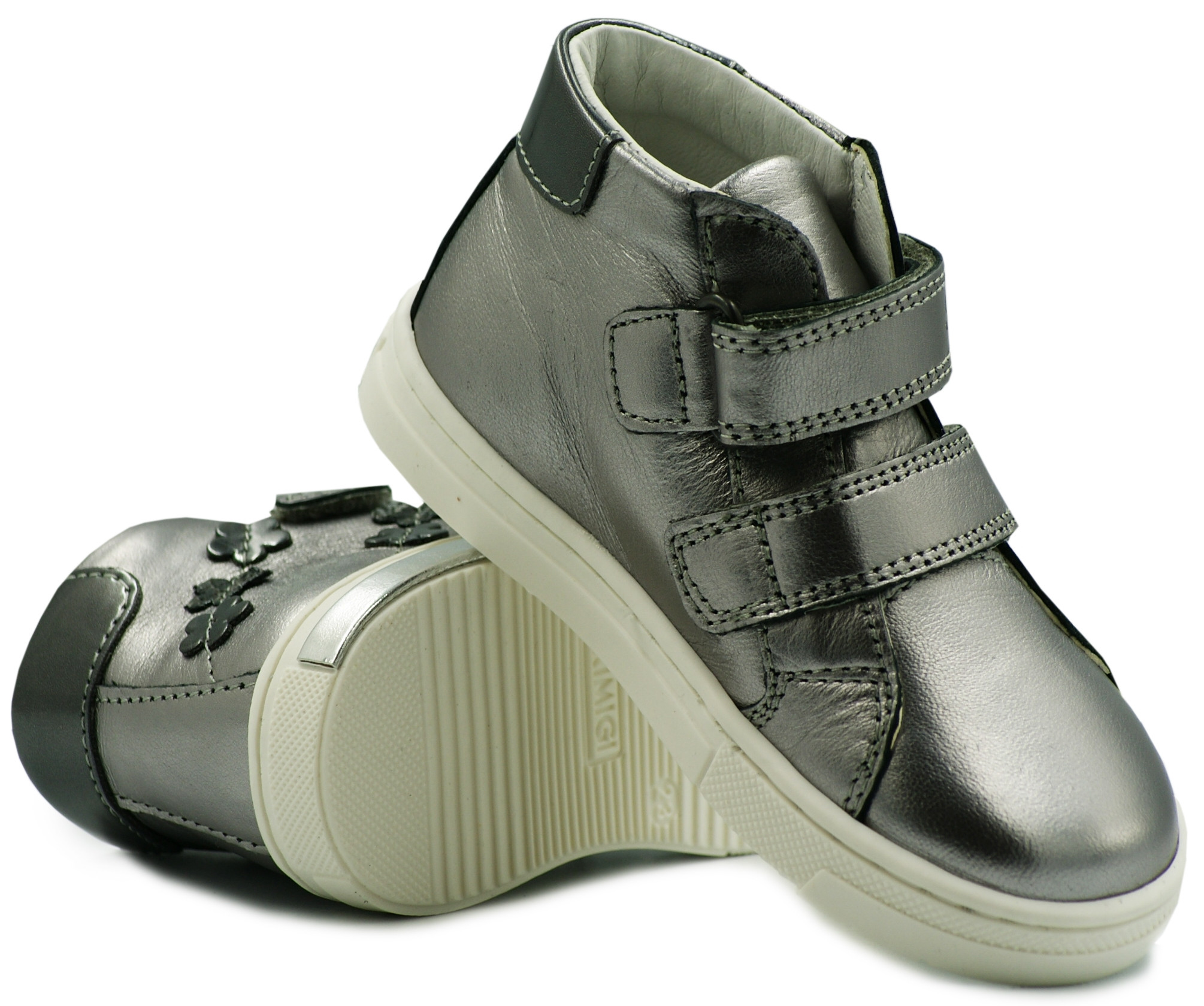 Obuwie na jesień PRIMIGI dzięki metalicznemu wykończeniu z kwiatuszkami prezentuje się bardzo modnie, elegancko i na topie.