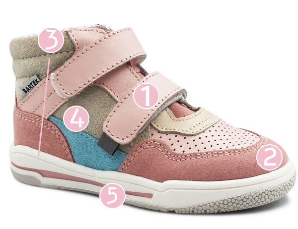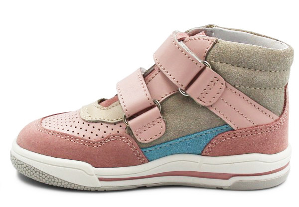 Buty dziewczęce wykonane z miękkich materiałów. Wkładka wykonana jest ze skóry, wypełniona miękką pianką. Zapinane za pomocą dwóch praktycznych rzepów, co ułatwia zakładnie obuwia. No końcu rzepu znajduje się dodatkowy element odblaskowy. Wnętrze obuwia wykonane jest ze skóry naturalnej. Górna część cholewki wykończona kołnierzem, który wypełniony jest pianką.