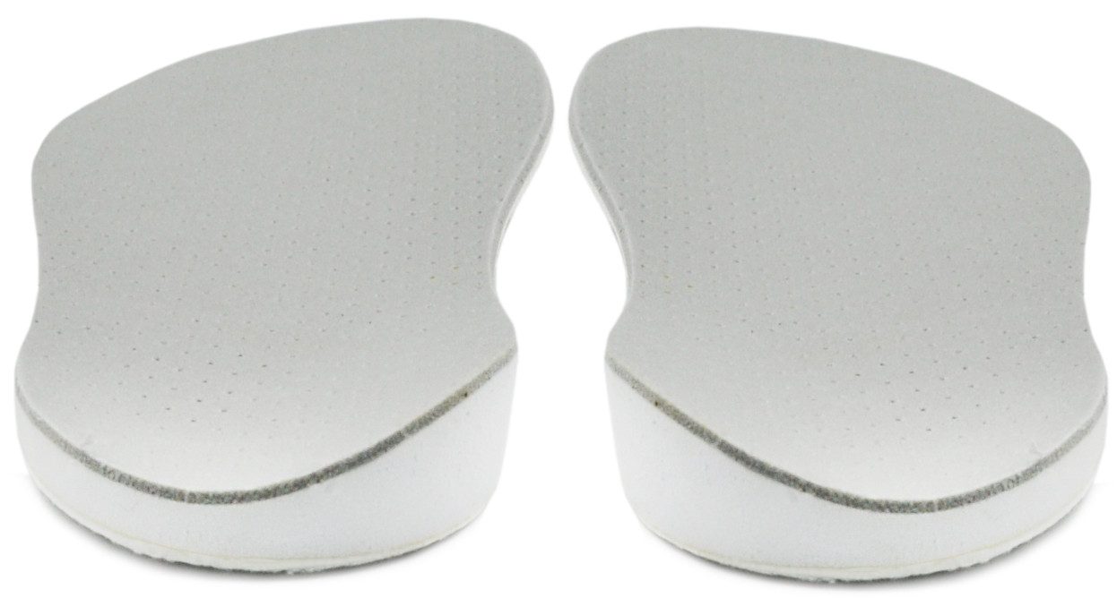 Wkładki "Correct S" posiadają wklejony specjalny klin korygujący, z podniesieniem po wewnętrznej stronie (1). Tak by zmusić stopy do korekcji, a co za tym idzie całe kończyny dolne do prawidłowej postawy ciała. Dodatkowo klin zapobiega pogłębianiu się wady.