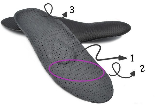 - Dodatkowo wkładki Comfort Plus Reduce P + T wyścielone są miękkim materiałem na przodostopiu (2) oraz tyłostopiu (3), w celu odciążenia mocno przeciążonych struktur.