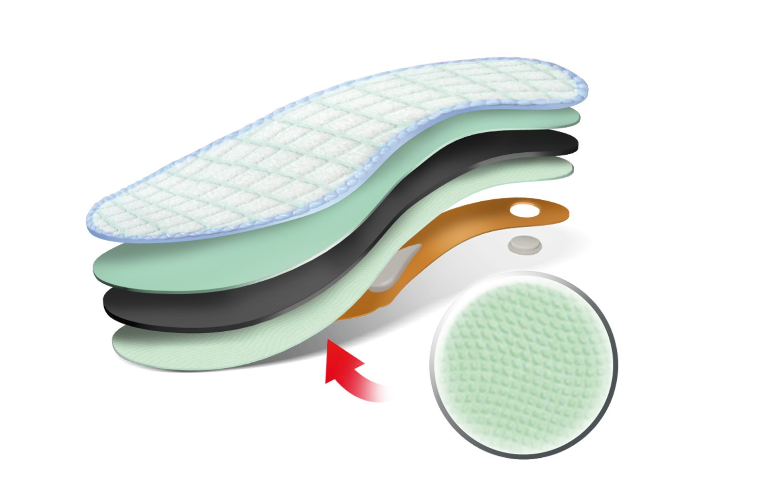 Włókna bambusowe, ałun i węgiel aktywny, dzięki swoim właściwościom, wpływają na ograniczenie powstawania nieprzyjemnego zapachu. Materiał wierzchni stykający się bezpośrednio ze stopą pochłania pot, zapewniając stopom świeżość.